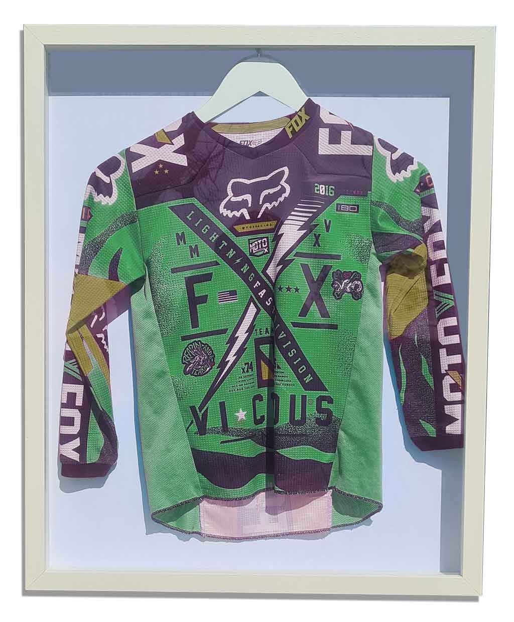 Personnalisez votre encadrement en choisissant un cadre vitrine noir ou blanc cassé et différentes couleurs de fond pour mettre en valeur votre maillot. De plus, chaque cadre est accompagné d’un cintre assorti à la baguette pour suspendre votre maillot en lui laissant la place du mouvement, comme si il était porté. Vous êtes une entreprise? Vous avez sponsorisé une équipe de sport locale? Alors rendez votre cadre unique et mémorable en commandant sans attendre notre cadre à maillot!